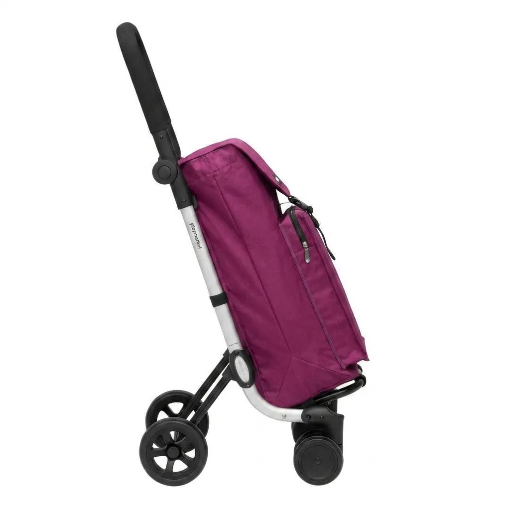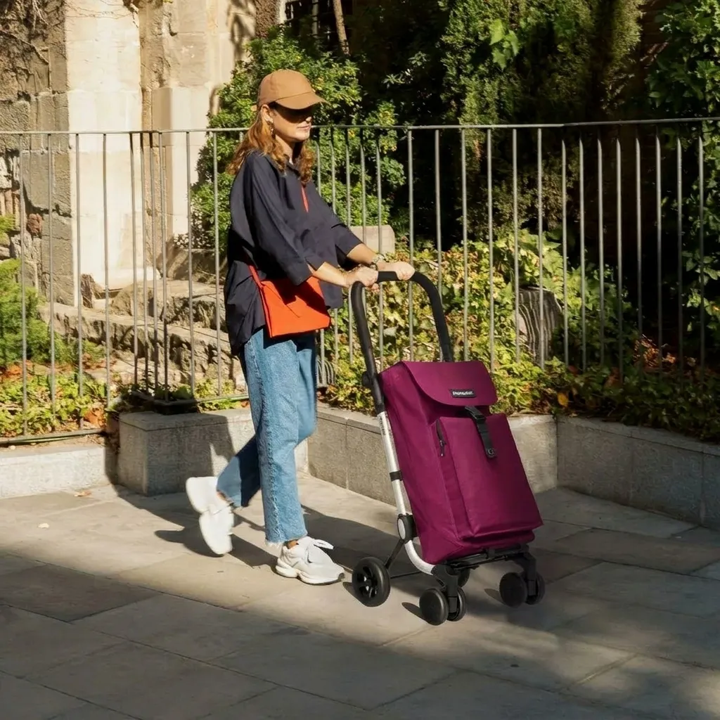 Pevný hliníkový rám se širokými trubkami oválného tvaru (30x15mm) se dvěma zadními velkými kolečky Ø 15cm a čtyřmi kolečky vepředu Ø 11cm. Madlo je nastavitelné do 4 výškových pozic. Pomocí stiskacích knoflíků na spodní části madla se nastaví požadovaná výška. Přední kolečka jsou plynule otočná kolem své osy oboustranně o 360º, takže hravě zvládnou pohyb tašky jakýmkoliv směrem. Kolečka z pevného odolného materiálu (EVA foam), kde je vrchní vrstva opatřena pryžovou vrstvou. Ta je oděruodolná i dostatečně robusní, aby vydržela provoz venku. Kolečka jsou nárazuvzdorná, odolná proti venkovním povětrnostním vlivům a nejsou hlučná ani nevržou. Taška zaručuje hygienickou čistotu díky řešení dvojitého vnitřku : základní velká taška o rozměru cca 30x22x 60cm (výška) je vybavena odepínacím vnitřním vakem, který v případě potřeby vyperete a tak máte nákupní prostor stále hygienicky čistý. Na přední straně je prostorná termokapsa uzavíratelná na zip. Tašku můžete tlačit před sebou na všech šesti kolečkách nebo jí táhnete klasicky za sebou. Jednoduše rozložíte nebo naopak sklopíte nohou osku ve spodní části tašky.
